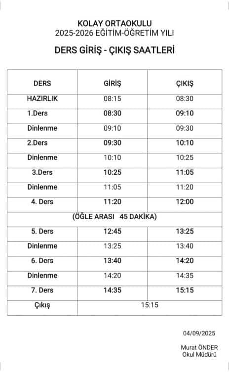 Yeni eğitim-öğretim yılına başlarken, okulumuzun derslere giriş ve çıkış saatlerinde bazı güncellemeler yapılmıştır. Bu değişikliklerin amacı, öğrencilerimizin daha verimli bir şekilde eğitim almalarını sağlamak ve günlük programlarını daha iyi planlamalarına yardımcı olmaktır. Yeni eğitim-öğretim yılının hepimiz için başarılı ve verimli geçmesini temenni ederiz. Destekleriniz için teşekkür ederiz! Saygılarımızla,